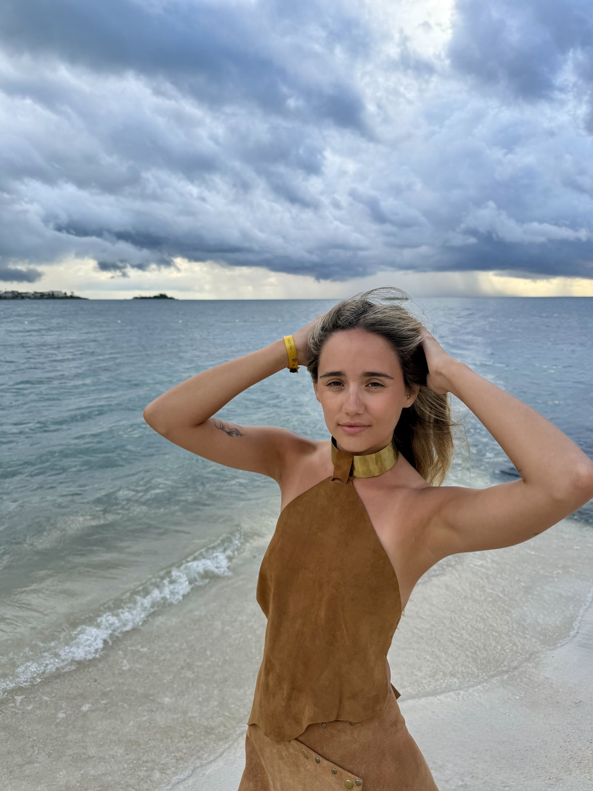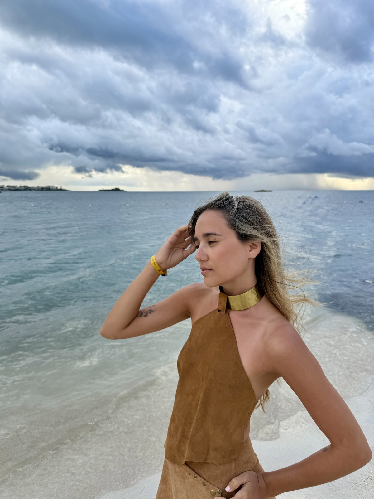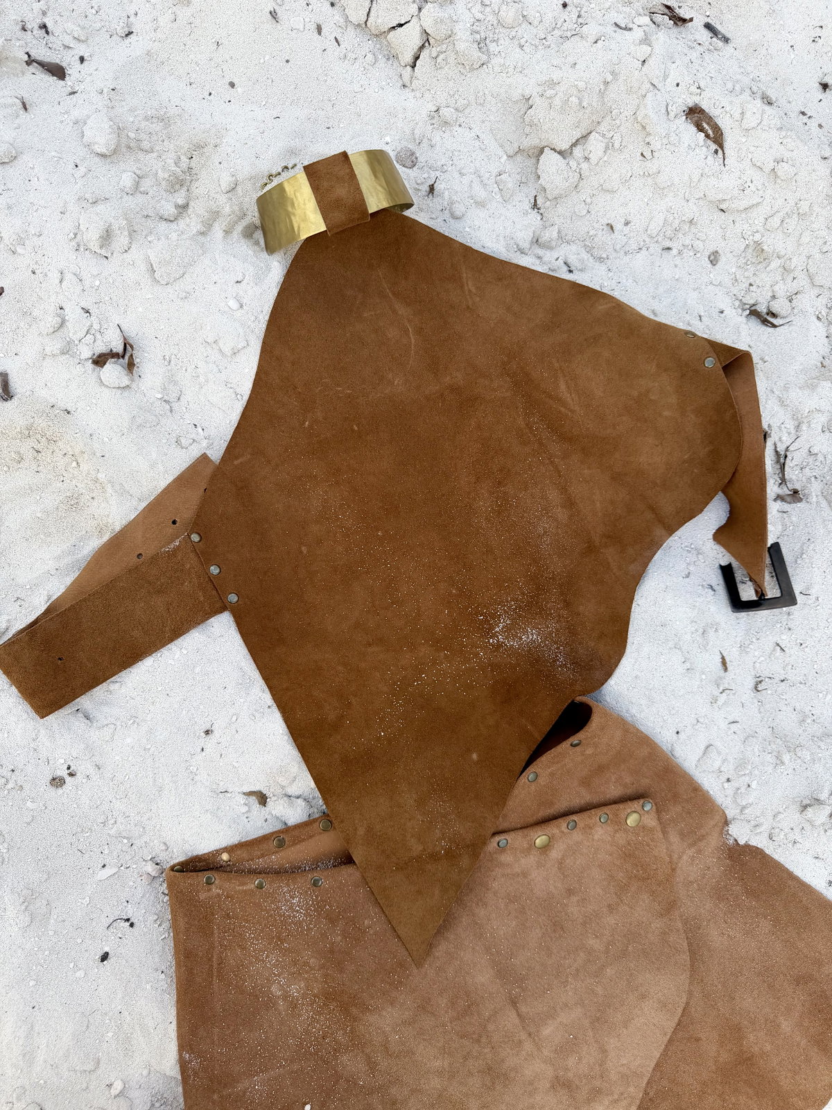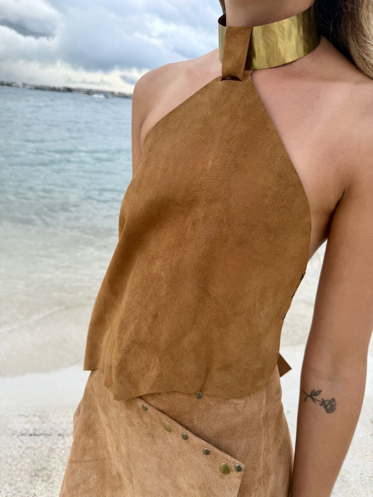 Top de cuero vacuno decorado con una gargantilla de bronce o alpaca.
