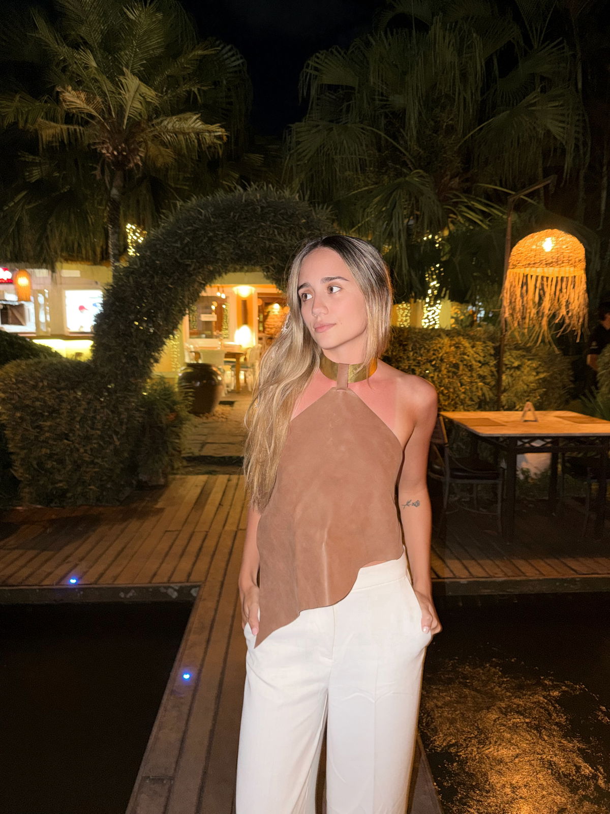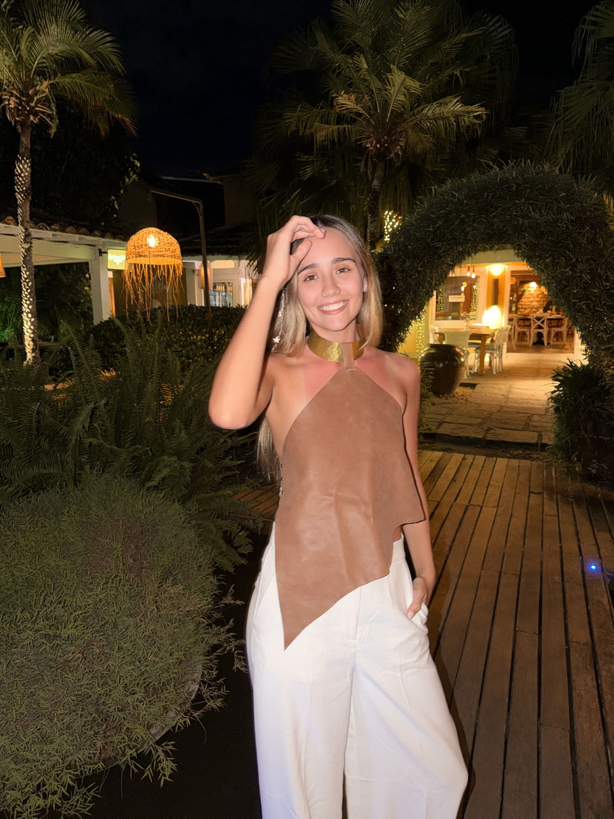 Top de cuero vacuno decorado con una gargantilla de bronce o alpaca.